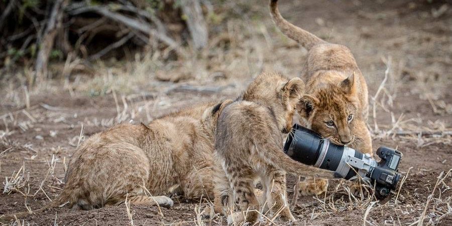 Lejon är bland de berömda "big five". De lever i flock och det visar sig att de också har stort intresse för exklusiv fotoutrustning. "Lejonungarna tar selfies". Så lät meddelandet en dag över radion till de andra guiderna under en game drive. Det måste vara varje fotograf's värsta mardröm att få sin kamera taget av ett djur under en safari, och i det här fallet hade safarigästen bara lagt ner sin kamera snabbt på marken. Men det tog inte lejonen lång tid att få tassarna på kameran och sen var det dags för lek och bus för den retsamma lejonfamiljen. Med beklagande måste guiden berätta för safarigästen att kameran tyvärr måste stanna hos lejonfamiljen för nuvarande.