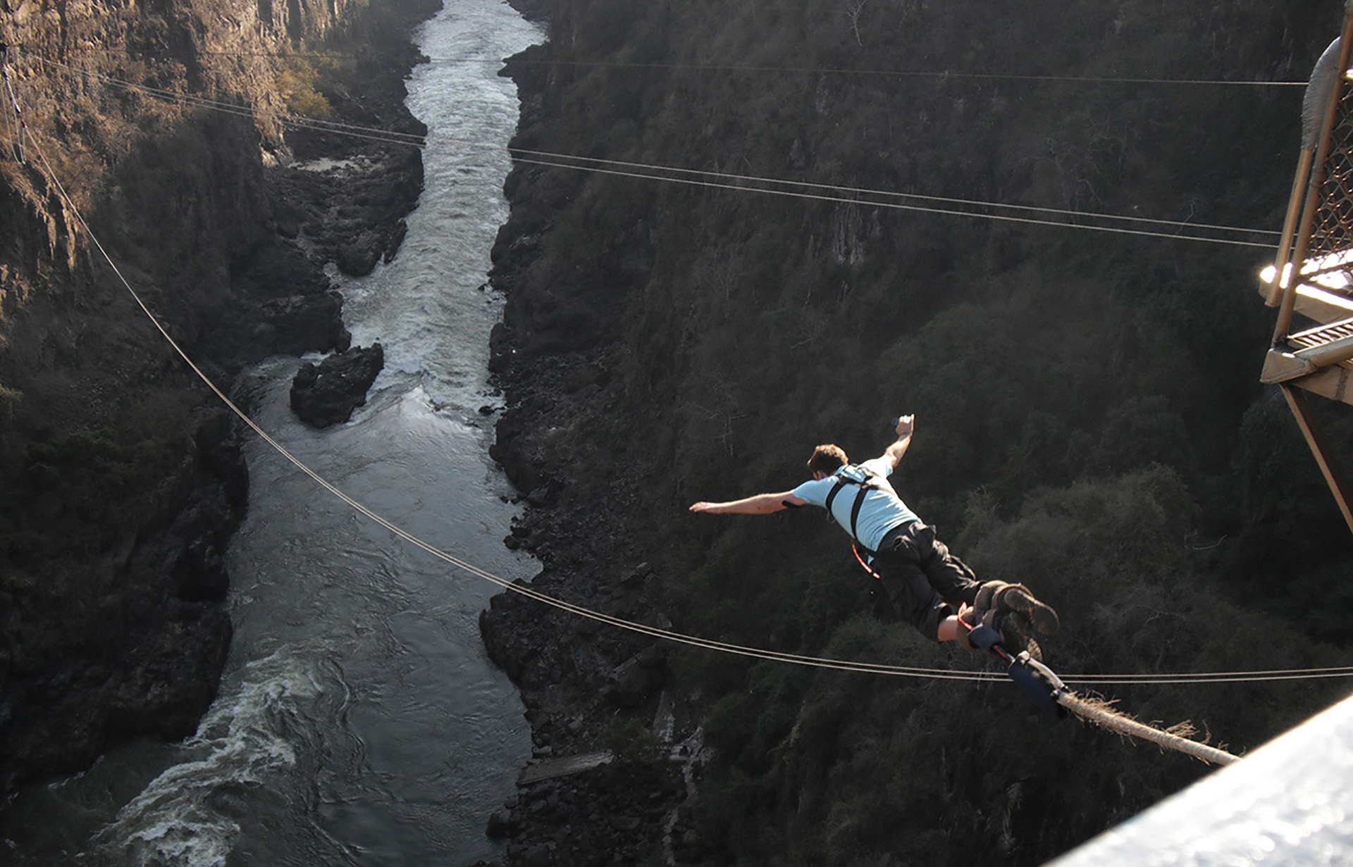 Få adrenalinen i gang med et elastikspring fra den 111 meter høje ikoniske Victoria Falls-bro, der forbinder Zimbabwe og Zambia. Bungee-jumping herfra giver udsigt over et af de mest sceniske naturområder i hele Afrika, og samtidig får du lov til at prøve noget, som mange har på toppen af deres bucket-liste. De professionelle arrangører instruerer dig naturligvis i forløbet og sørger for at skabe rammerne for en uforglemmelig oplevelse for dig. Tør du rykke dine grænser og bogstavelig talt springe ud i det? Hvis ikke, kan du stadig være fortrøstningsfuld. Til de mere forsigtige kan en tur med svævebane over slugten anbefales som et alternativ. Flere steder i området er der spændt kraftig stålwire over kløften, hvor den længste glidetur er hele 425 meter. Her kan du i et mere behageligt tempo opleve den fantastiske udsigt med Zambezi-floden rindende under dig.