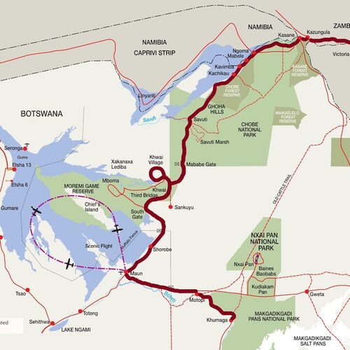 Vid vissa avgångar startar safarin i Victoriafallen och avslutas i Maun (omvänd ordning i programmet men ni besöker samma platser).