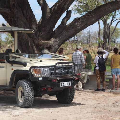 Vid en fullbokad avgång med 12 deltagare används en stor 4x4-safaribil. Guiden ser till att rotera platserna så att sol och vind fördelas jämnt eftersom det inte finns fönsterplats för alla.