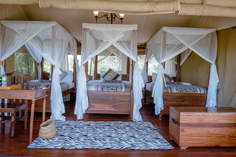 Tresengs værelset, med tre senge, rummelig veranda, skrivebord og sofa, imødekommer grupper af venner eller familier, der ønsker en autentisk safarioplevelse. Beliggende på de åbne marker i Acacia Central Camp, bringer det dyrelivet tættere på gæsterne.