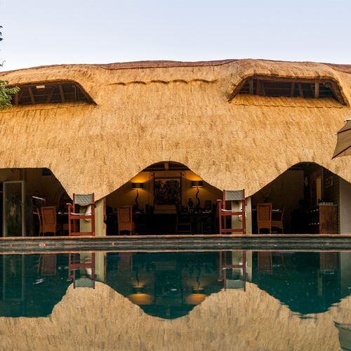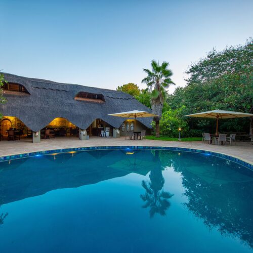 Centralt på lodgen finns den stora tårformade swimmingpoolen som omges av Dining Boma och baren.