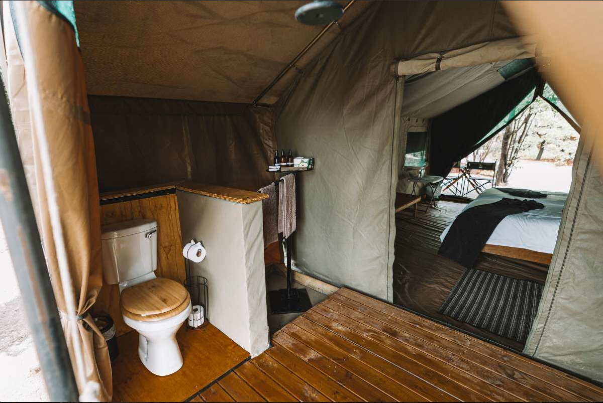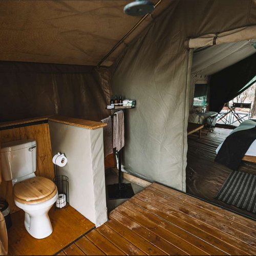 Der er i alt 7 telte. Hvert telt er er store, og rummelige. Der er højt til loftet og der er faciliteter med både bad og toilet.