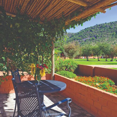 Damara Mopane Lodge fremstår som en arkitektonisk perle, der minder om en fortidig afrikansk kongerige, placeret i en halvcirkel af sammenkædede stier, der fører til en overdådig swimmingpool i midten. Hvert chalet er innovativt designet med sin egen lille have, hvor grøntsager som sprudlende solsikker, spinat, rødbeder og skæve fugleskræmsler skaber en fortryllende atmosfære. Lodgeområdet byder på et labyrintisk netværk af stier, der leder til et stort og lyst fællesområde, hvor frisk grønt og hjerteformede mopane blade pryder interiøret.