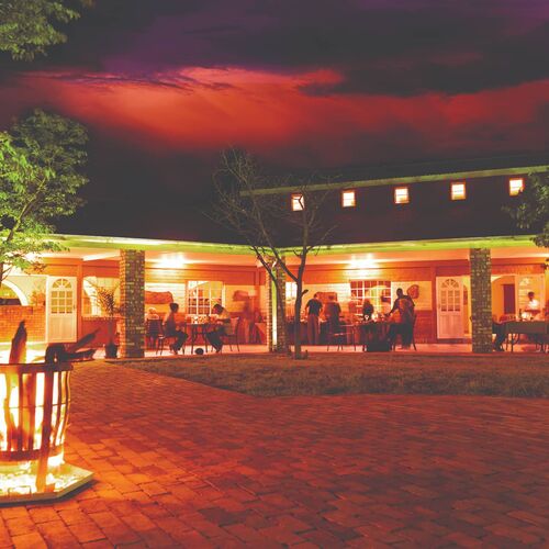 Et højdepunkt på dagen er at bestige bakken til et udsigtspunkt for at nyde en storslået udsigt over mopane skoven oplyst af solnedgangen. Dette er også det bedste sted at nyde en solnedgangsdrink og få et overblik over den fascinerende konstruktion af lodgen. Når dagen bliver mørk, er det tid til at vende tilbage til restauranten, hvor en hyggelig ild brænder i en pejs, og en lækker middag venter, serveret med et fint udvalg af friske grøntsager og urter.
