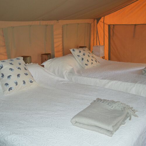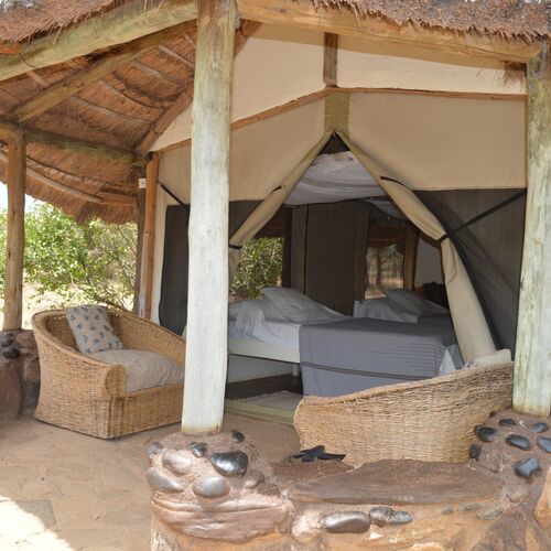 Den eksklusive lodge består af seks rummelige hytter og telte, som alle er bygget af natur- eller genanvendte materialer. De fleste er indrettet med mulighed for at bo som familie eller gruppe og har eget badeværelse.