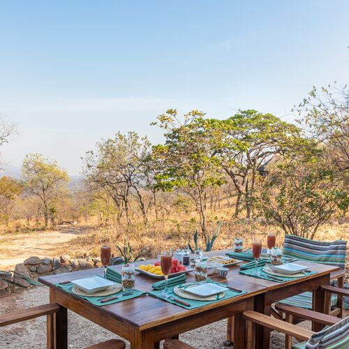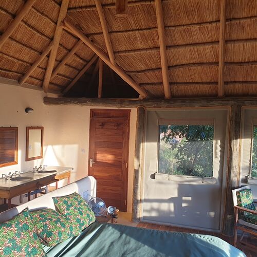 Teltsuiterne er lækkert indrettede med stor møbleret teaktræs balkon med behagelige møbler, hvor man kan sidde og nyde den fantastiske udsigt, store rummelige soveværelser med gode senge, samt murede badeværelser med toilet, bruser og håndvask. Teltdugene har åbne sider, naturligvis med insektnet, så man kan nyde udsigten også inde fra teltet, og alle teltsuiter har stråtag. Måltiderne indtages normalt omkring et stort åbent ildsted, og ved baren og loungen er der også en lille pool samt udsigt til det nedenfor liggende vandhul, hvor flere forskellige dyr, bl.a. kudu, impala, zebra, bavianer og vortesvin kommer for at drikke. Med lidt held kan både elefanter og leoparder også komme forbi.