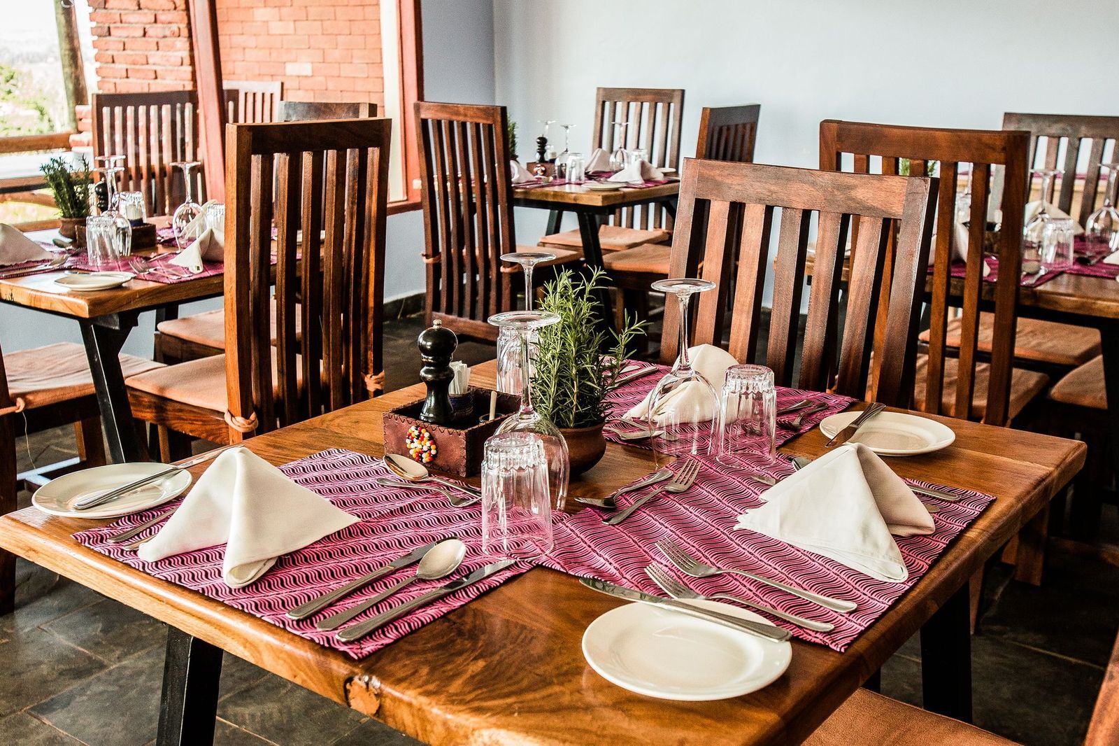 Lodgens mysiga bar och matsal ligger i huvudbyggnaden med utsikt över poolen. En stor utomhusterrass med två eldstäder erbjuder både avkopplande sittplatser och möjligheter till att äta utomhus. Här serveras både frukost, lunch och midda. All mat är färsk och lokalt producerad från omgivande jordbruksområden. Safari-lunchlådor finns tillgängliga på begäran.