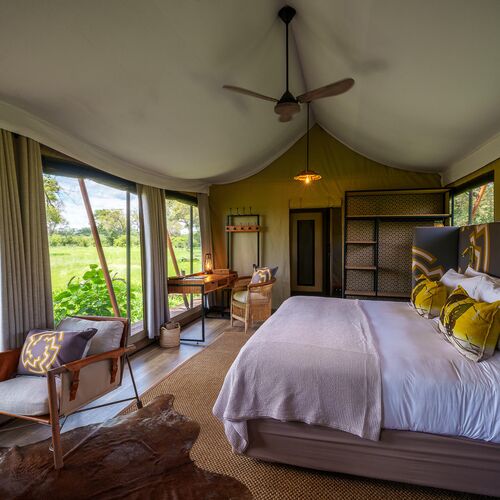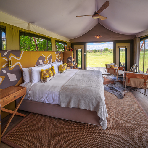 Karangoma tilbyder 6 rummelige telte (inklusive et familieværelse), som er skjult på en træbevokset halvø, skygget af leadwood- og pølse-træer, der stikker ud i en Okavango-flodslæt og har udsigt over en velbenyttet dyresti til vandet. Et soveværelse og en lounge (stilfuldt indrettet med en moderne fortolkning af teksturer, farver og mønstre inspireret af den ikoniske Hambukushu-kurvning fra den nordlige Okavango), samt et tilstødende badeværelse og indendørs og udendørs brusere, maksimerer udsigten over flodslætten. Lounge- og spiseområderne har også en imponerende udsigt over flodslætten til vandet, med en nærliggende ildsted og en lille pool, der fuldender de offentlige områder.