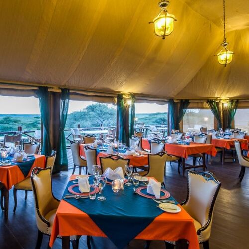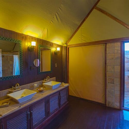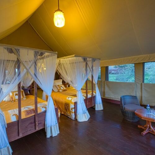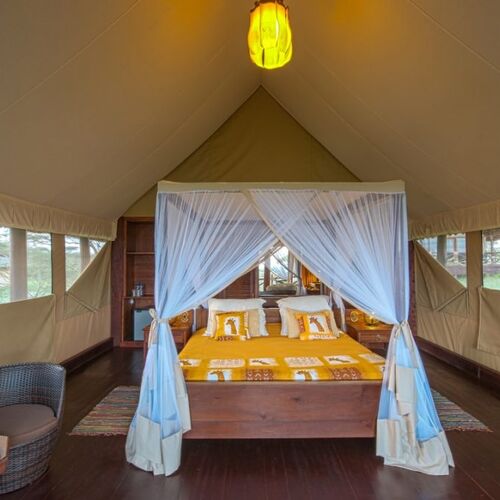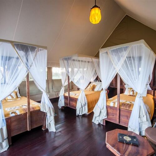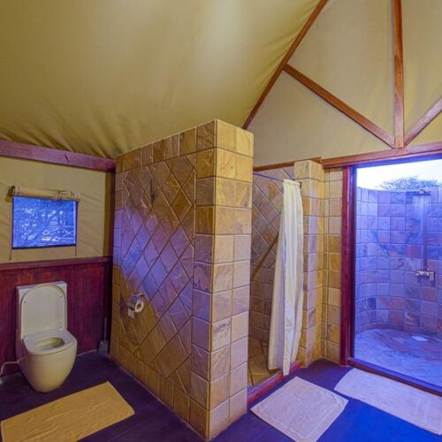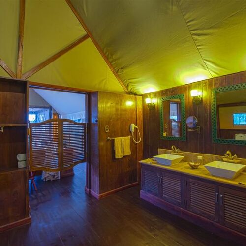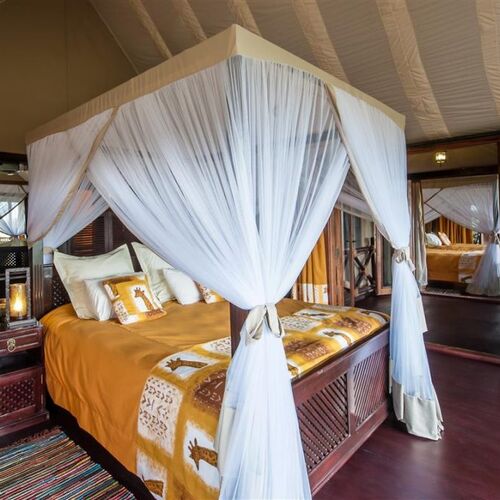 Här erbjuds en äkta afrikansk safariupplevelse med en unik blandning av natur och lyxig boende. Tälten har stora sängar med myggnät, nattduksbord, rottingstolar med soffbord, garderob, hårtork, toalettbord, skrivbord med stol, bagageställ, ett minibar-kylskåp och te- och kaffefaciliteter.