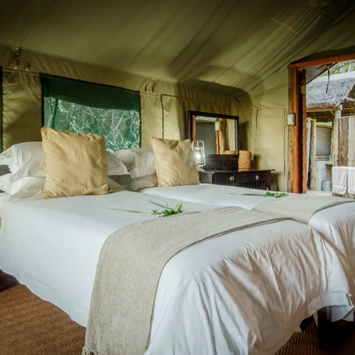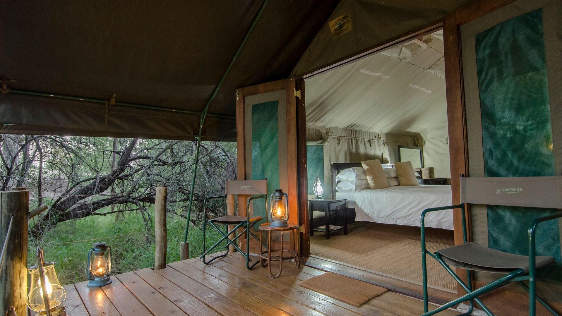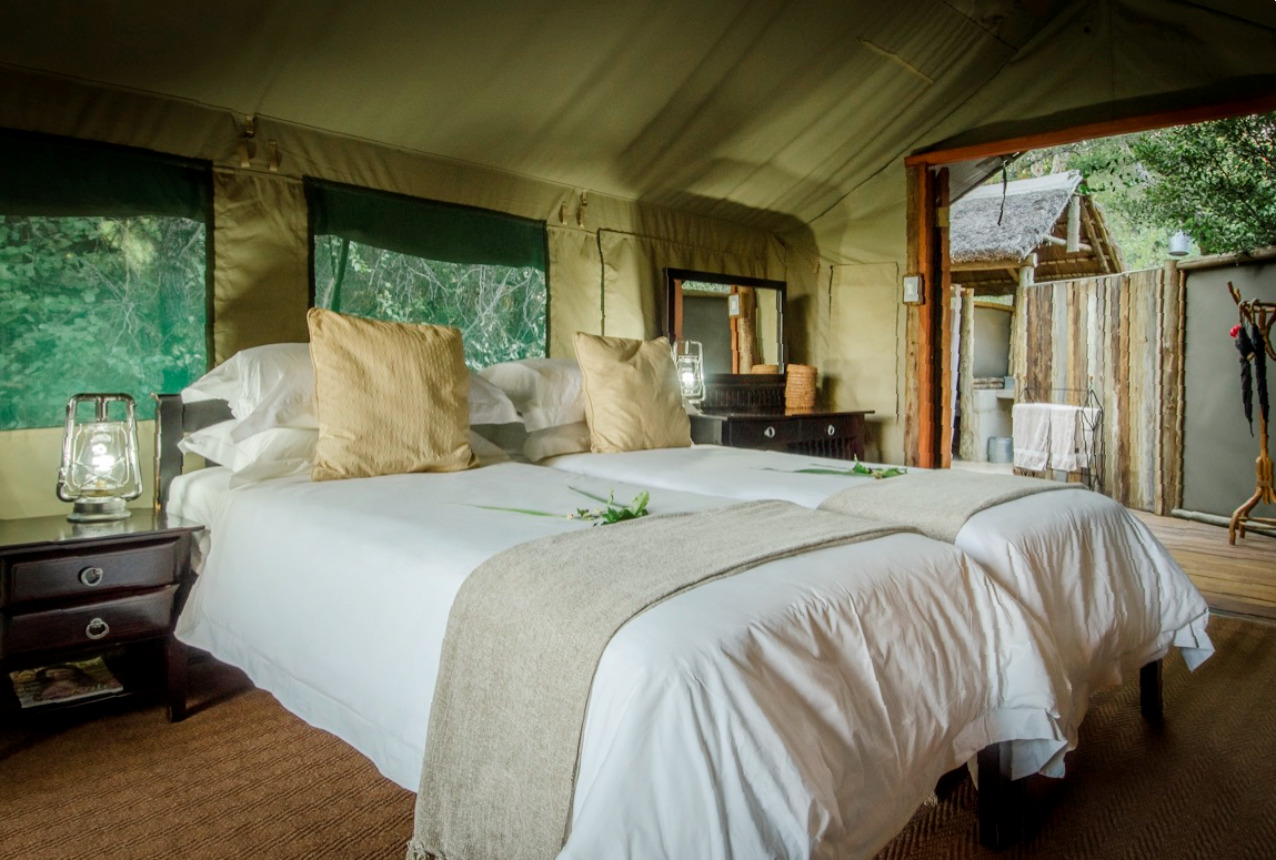 Campen dækker over 8 private telte, som er rummelige, komfortable og store nok til at voksne ikke behøver at dukke sig for at bevæge sig rundt i inde i dem. Hvert telt er monteret på et betongulv og har egne private udendørs faciliteter inklusiv toilet og bad.