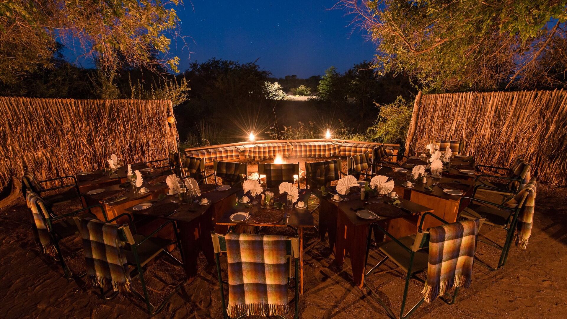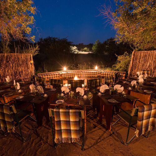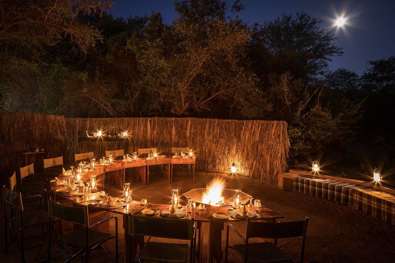 I Mashatu Tent Camp er øjeblikkelig kammeratskab normen. Her deles måltiderne med udsigten over det oplyste vandhul nær ved.