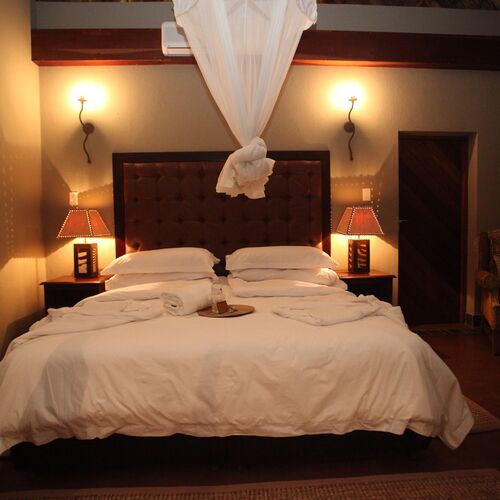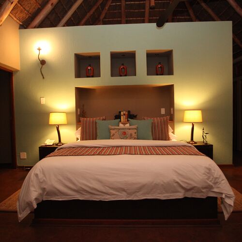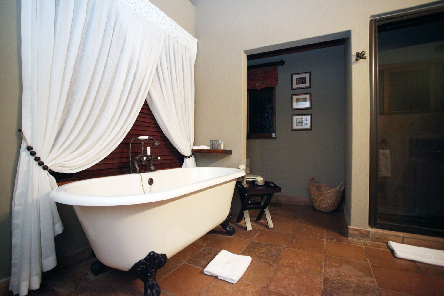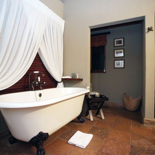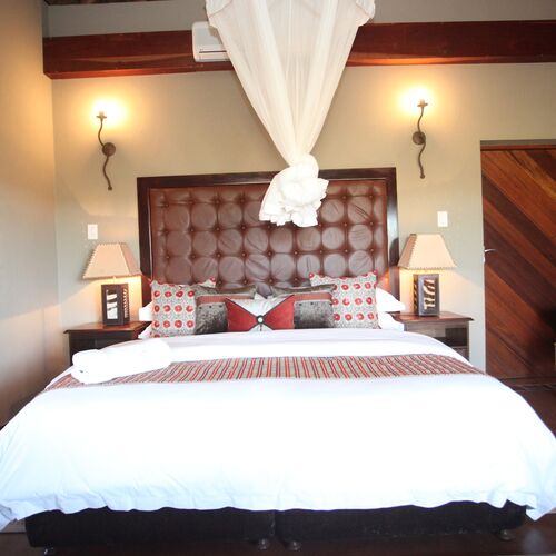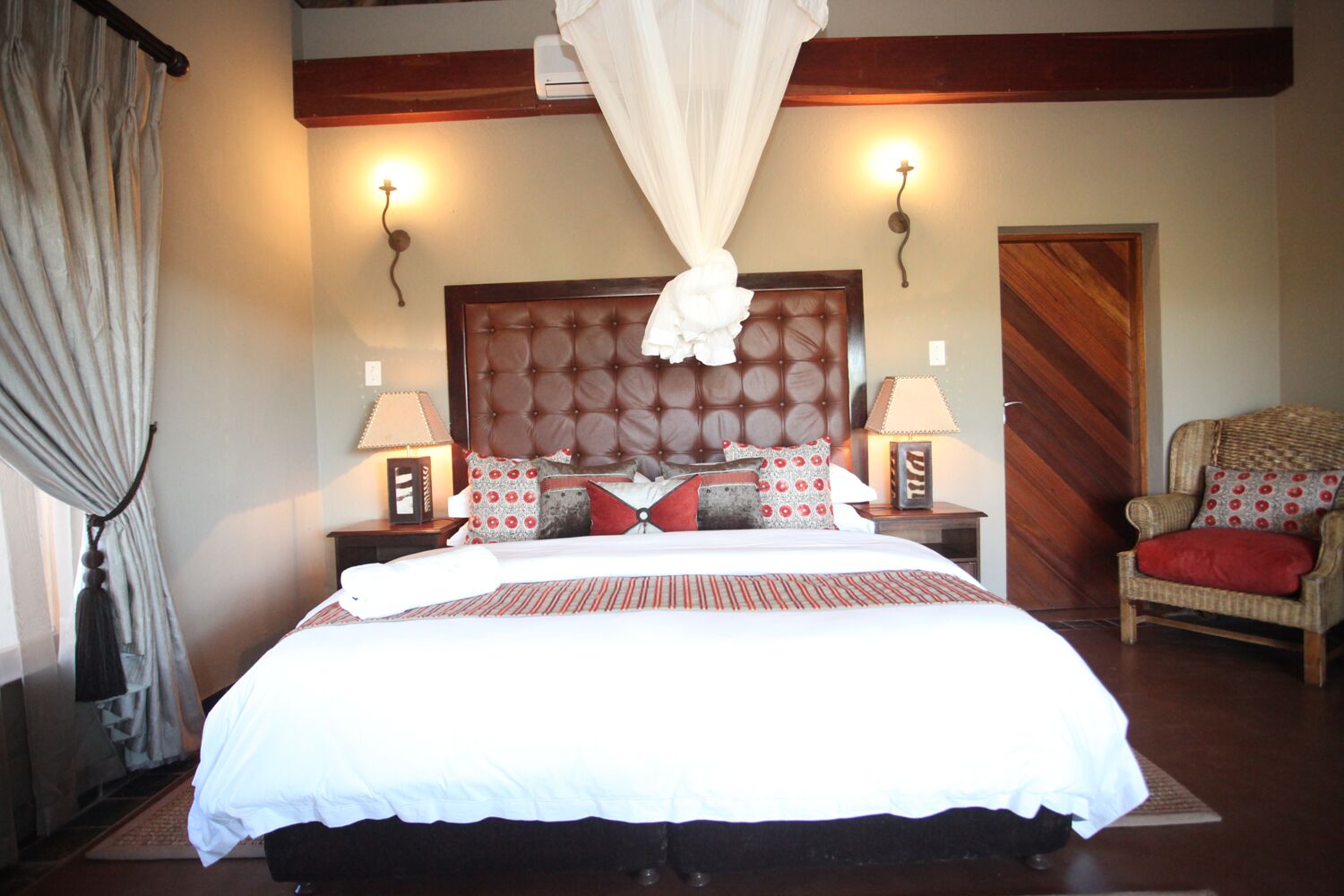 Luxury suiten er rummelig med udsigt til bushen. Her er en king size seng, og desuden udstyret med med alt fra air-condition, sikkerhedsskab, minibar, en-suite badeværelse med både bruser og badekar mm.