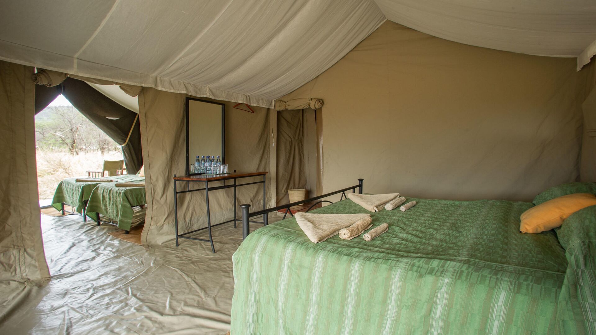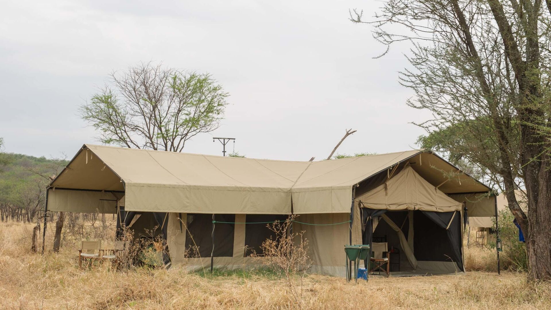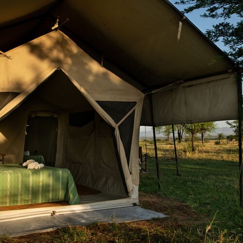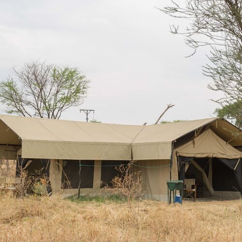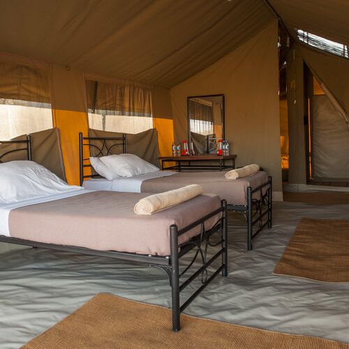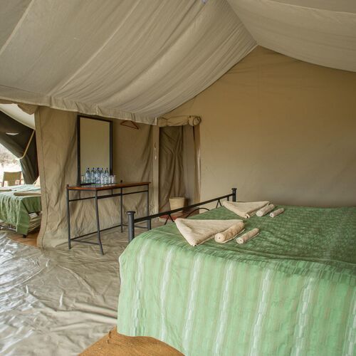 Lejren består af komfortable, rummelige safaritelte med privat badeværelse, herunder spandbruser og toilet. Teltene er enkelt og funktionelt indrettet med senge, natborde og bløde tæpper, og de er designet til at blende ind med naturen omkring. Hver enhed har en lille terrasse foran, hvor gæster kan sidde og nyde solopgangen eller høre dyrene i det fjerne om natten.