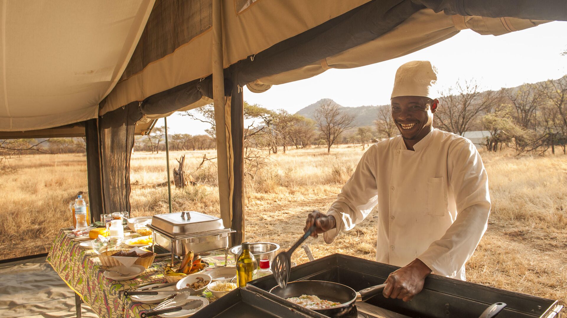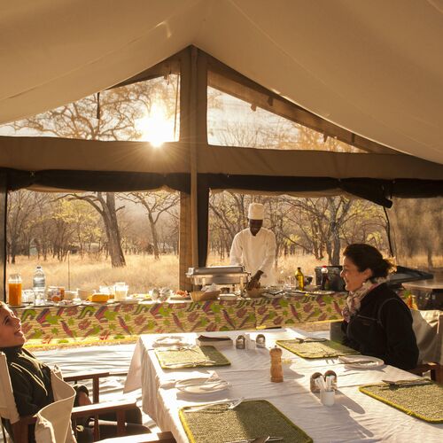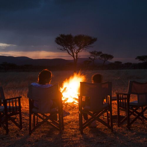 Om aftenen tændes der bål, og gæsterne kan samles under stjernerne og dele dagens safarioplevelser.