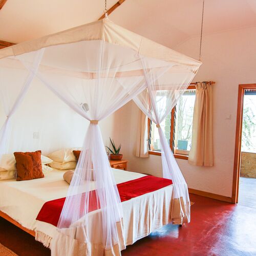 • 1 fritstående hytte med 2 separate soveværelser (1 dobbeltseng, 1 twin), en rummelig stue, spiseområde og 2 private verandaer. Denne hytte ligger i en mere afsidesliggende del af lodgen og er ikke ideel for familier med små børn.