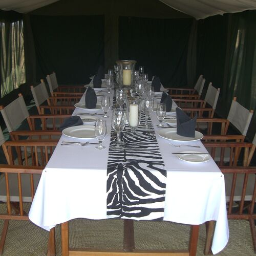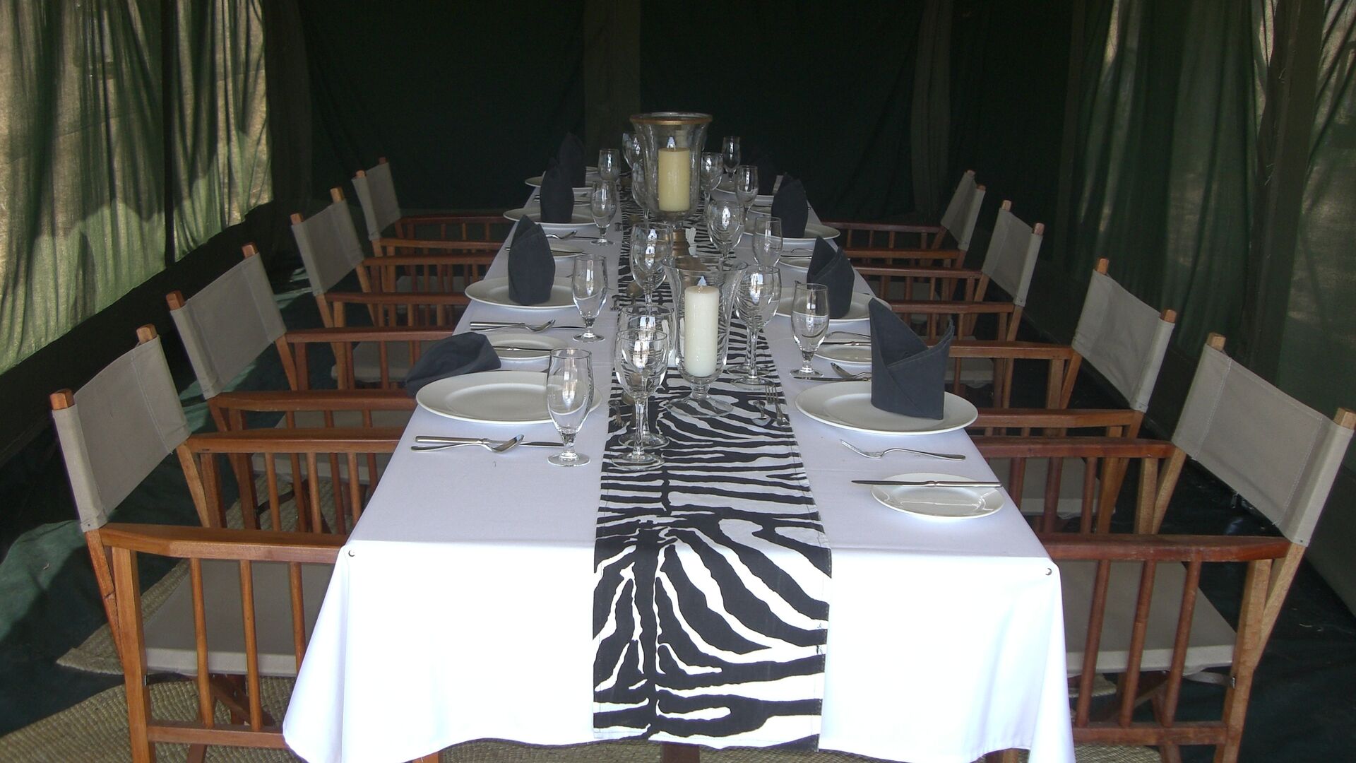 Der er et fælles telt til måltider med stole, borde med dug, bestik, porcelæn og hvad man ellers forventer på en restaurant. Der er 3 måltider hver dag, morgenmad, og 3-retters frokost og middag. Om aftenen sidder man ved det knitrende bål og lytter til den afrikanske bush der vågner til natten. Der er insekterne lige ved siden af og måske et brøl i det fjerne.