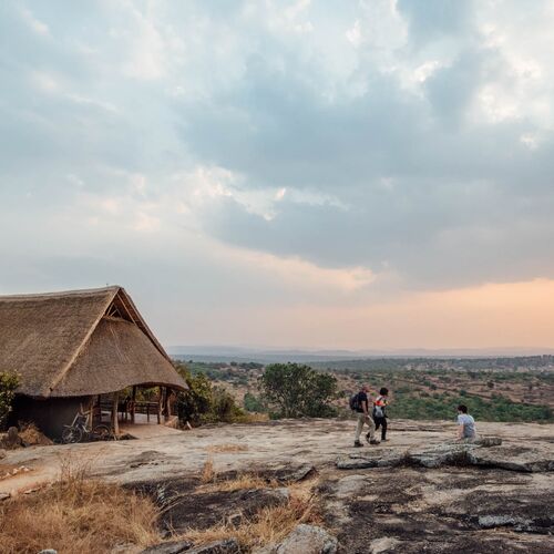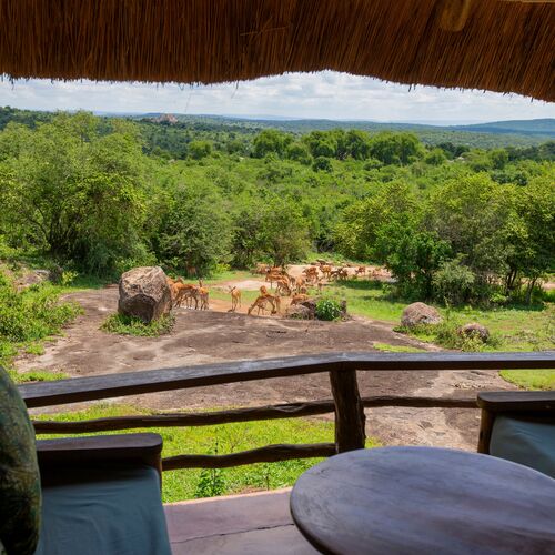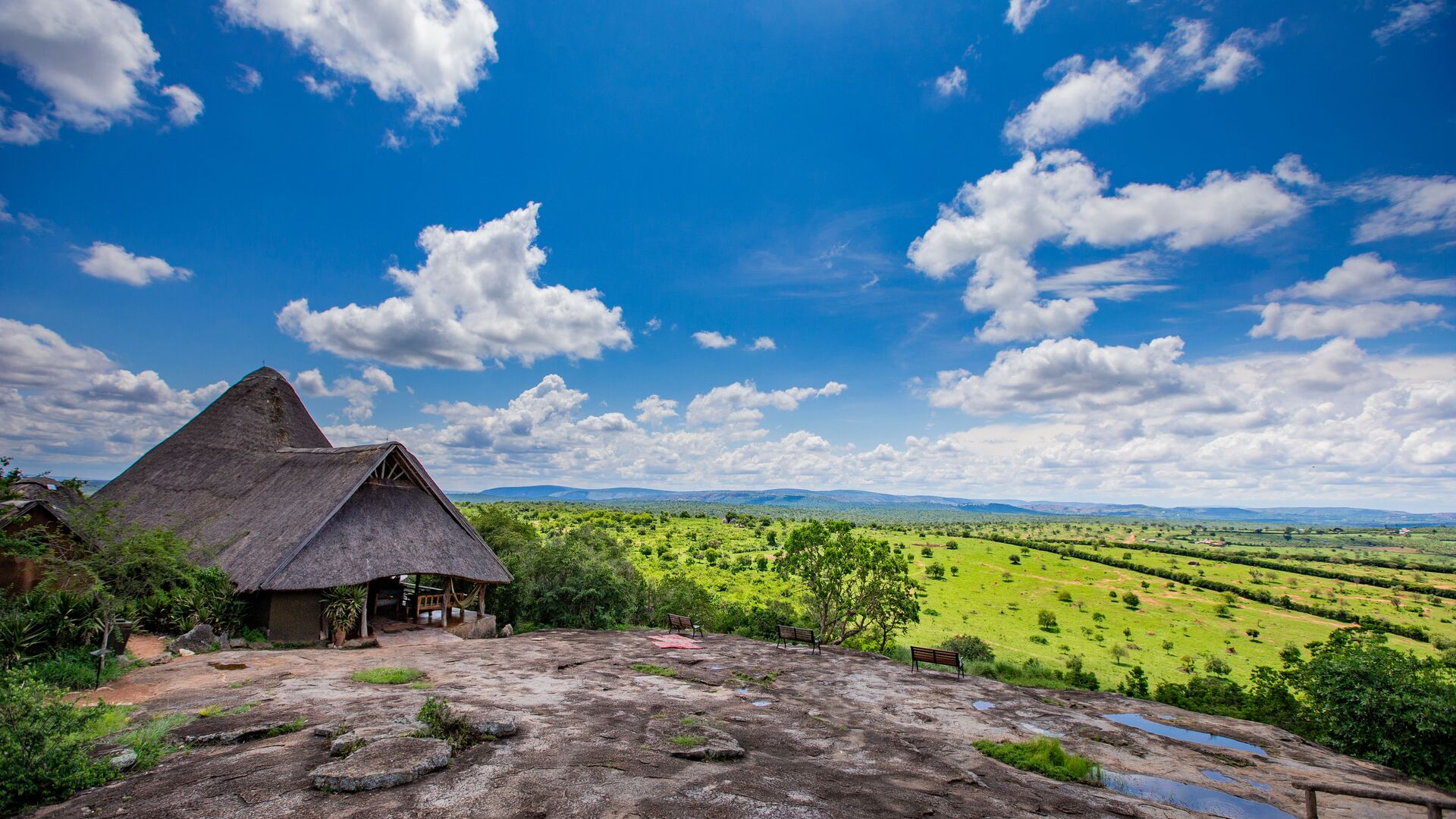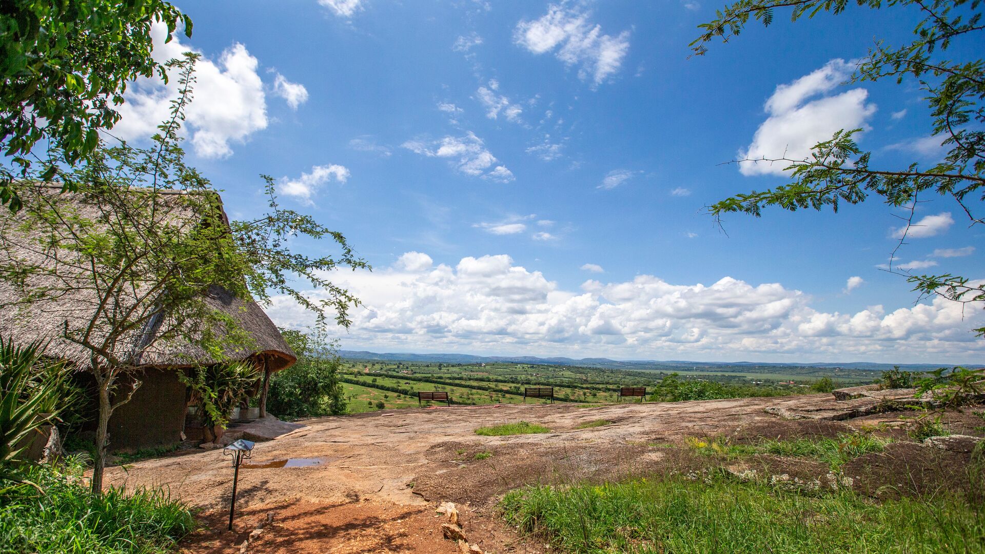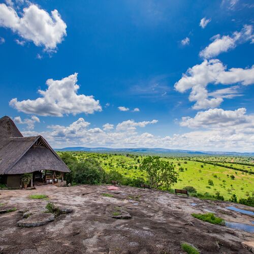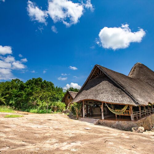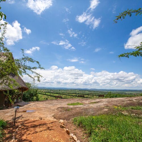 Rwando Rock är belägen på en naturskön klippa med en fängslande utsikt. Djur som zebra, vildsvin, impala och bushbuck finns runt stugorna och samlas ofta vid vattenhålet som kan ses från matområdet.