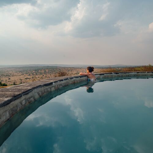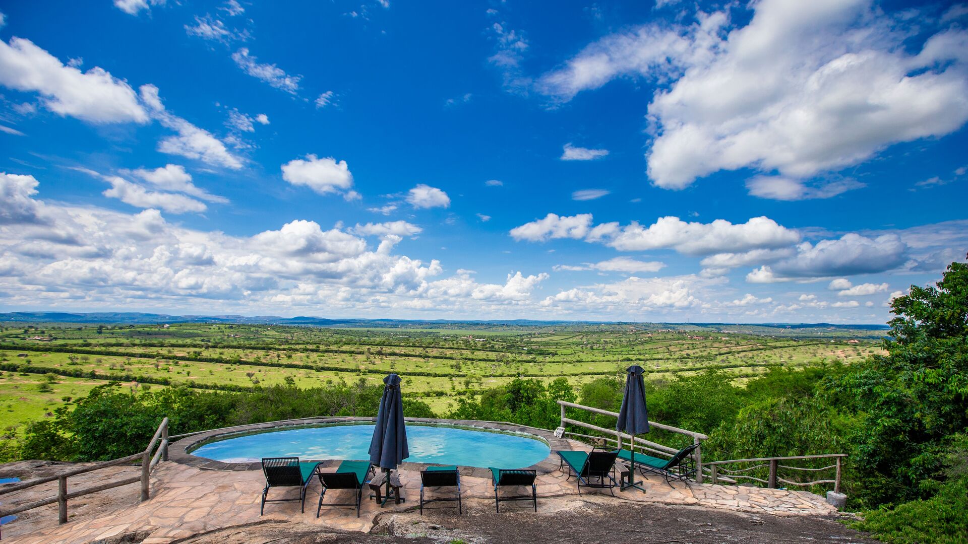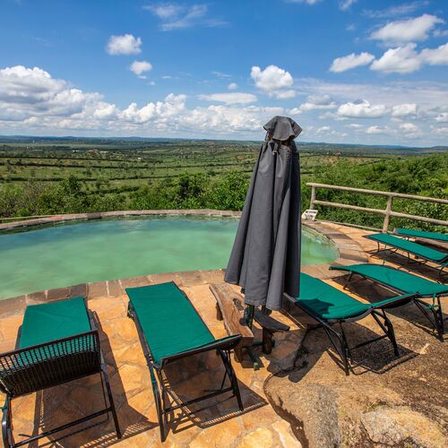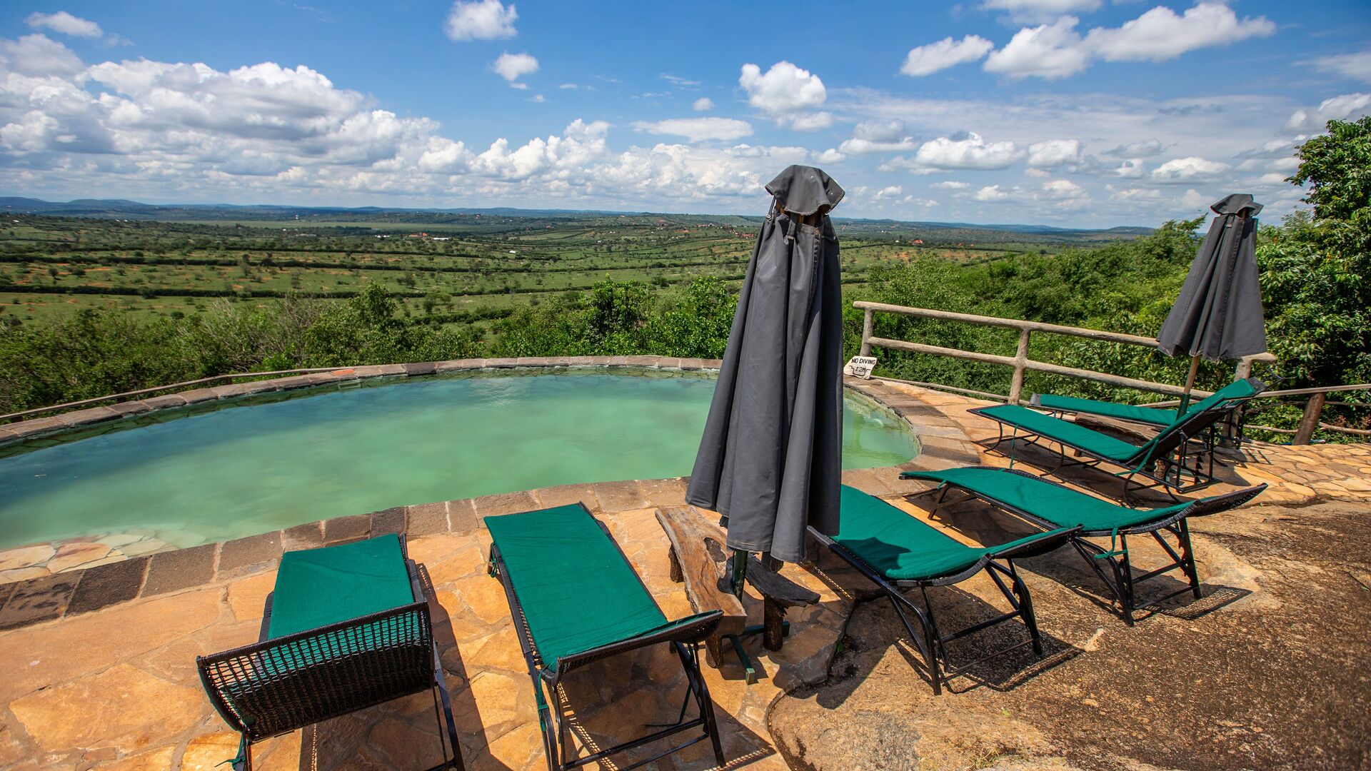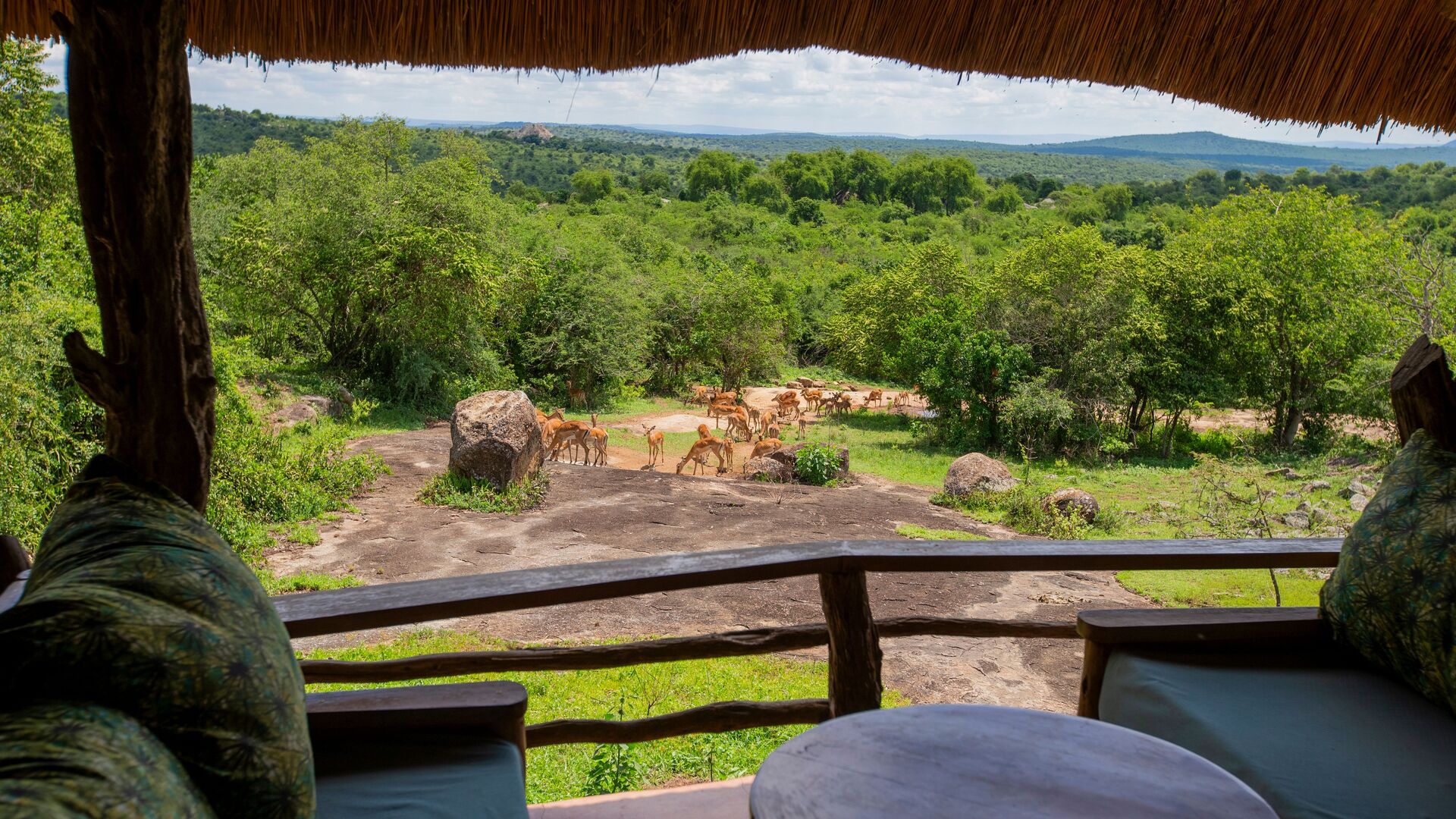 Rwando Rock är belägen på en naturskön klippa med en fängslande utsikt. Djur som zebra, vildsvin, impala och bushbuck finns runt stugorna och samlas ofta vid vattenhålet som kan ses från matområdet.