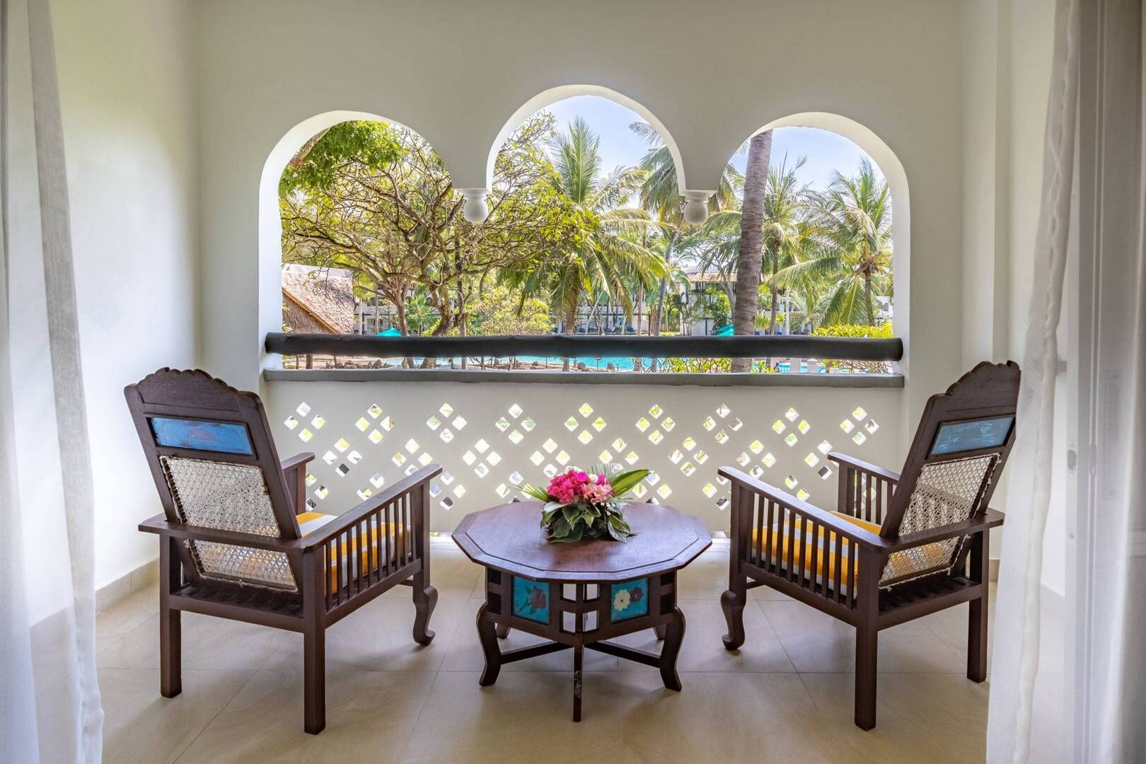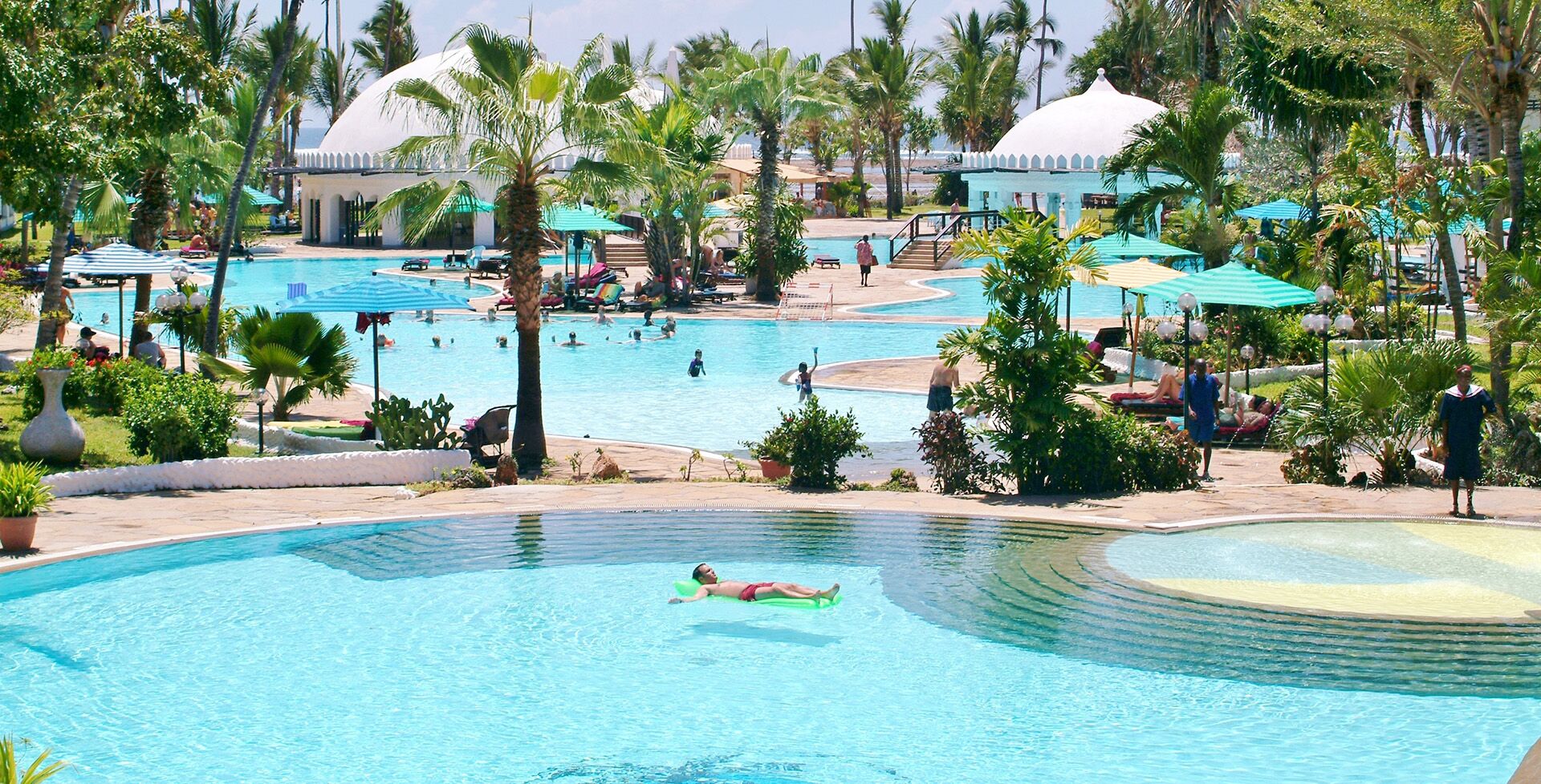 Southern Palms Beach Resort vid Diani Beach vid Mombasas sydkust ligger med stora pooler precis vid stranden och den Indiska oceanen.