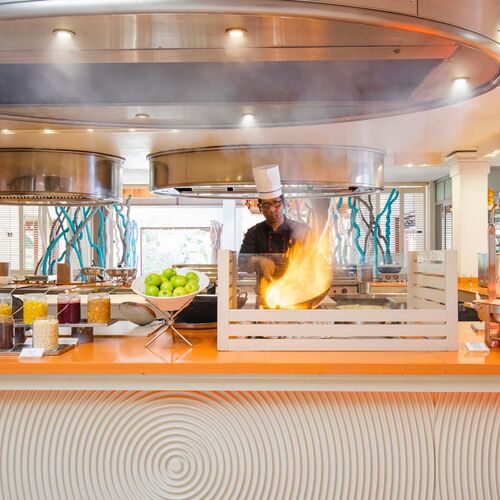 Hovedrestauranten, Show, byder gæster velkommen til overdådig morgenbuffet og sjove teatralske middage.
