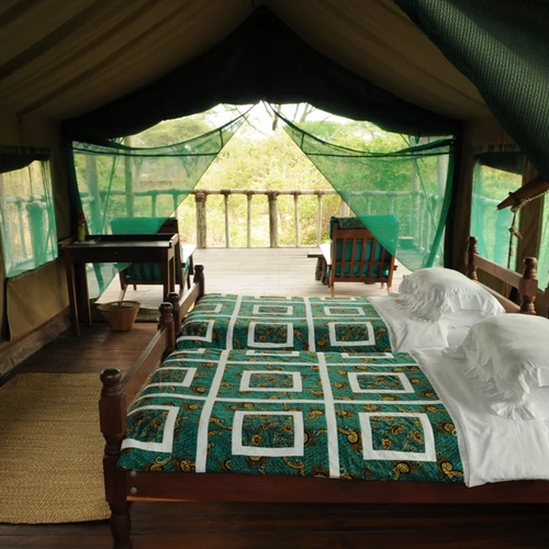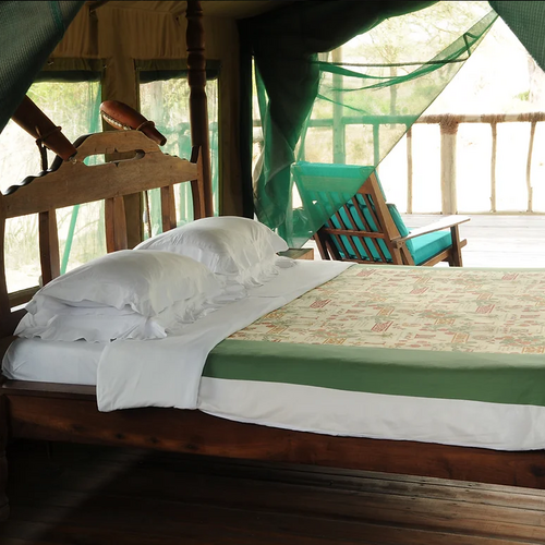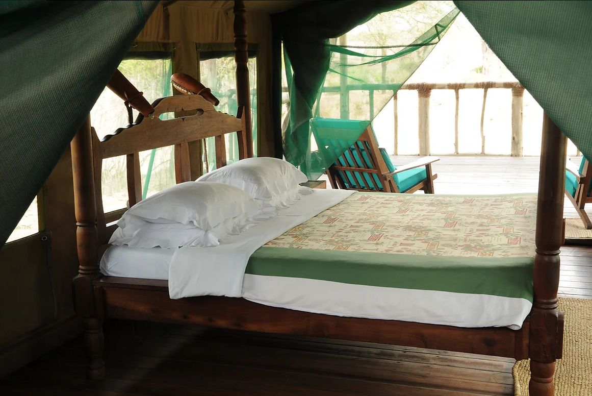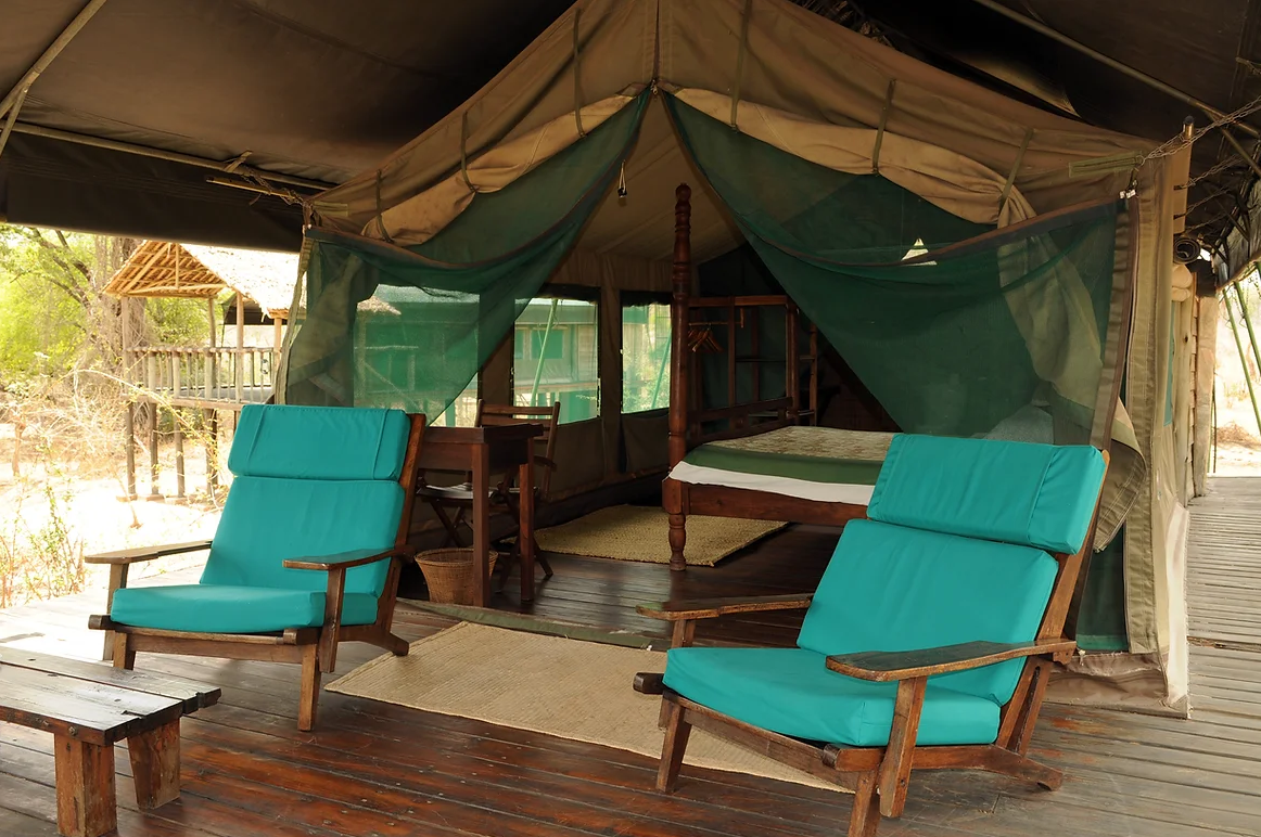 Elleve rummelige, forhøjede luksustelte tilbyder forskellige arrangementer af dobbelt- eller enkeltsenge. Ekstra senge er tilgængelige for børn eller en tredje person. Belysningen leveres af solenergi døgnet rundt, og hvert telt står mindst otte meter væk fra det næste for fuldstændig privatliv og afsideshed. Det indbyggede badeværelse bag hvert telt er indrammet i strå og sten og har udsigt over bushen. Solopvarmede brusere tilbydes. Foran hvert telt er der en rummelig veranda med komfortable siddepladser, perfekt til afslapning og dyresafari langs Mdweka-sandfloden.