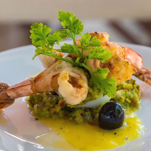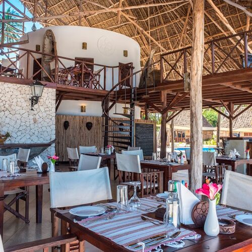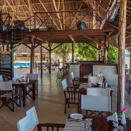 Hotellet har en restaurang och bar precis vid stranden som är ljus, luftig och inredd i originalstil där man inte har kompromissat med utsikten över havet. Det finns en extra våning på restaurangen som är avsedd som ett avslappningsområde där man kan njuta av den fantastiska utsikten över ön, Mnemba Island. Restaurangen har en hög standard och maten är av lokalt producerade råvaror. De kulinariska traditionerna som man hittar runt Indiska Oceanen i harmoni med kryddor från Zanzibar gör att man njuter av fantastisk mat i vackra omgivningar. Baren har ett bra utbud av drinkar, vin, öl och cocktails samt gott kaffe.