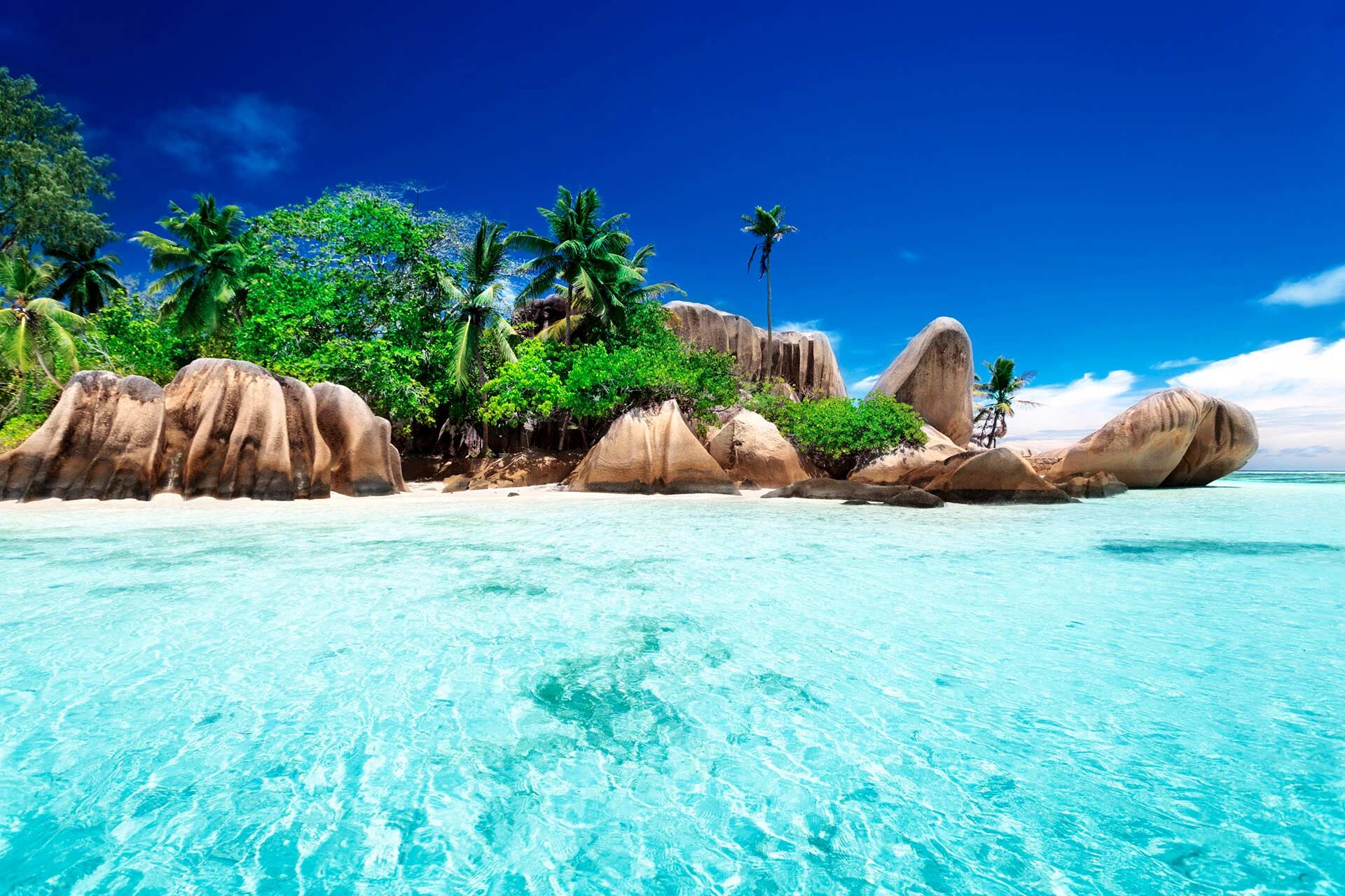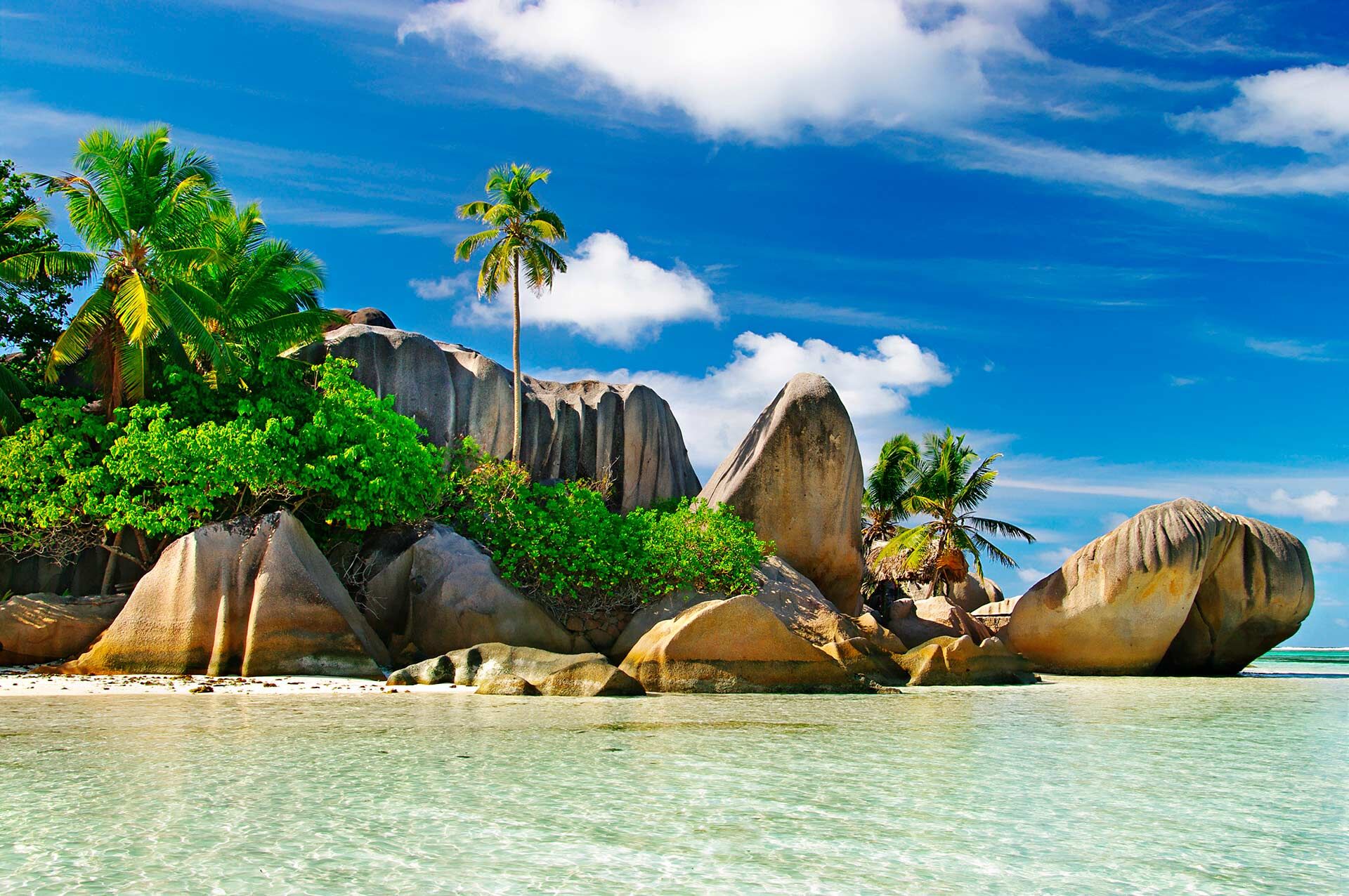 La Digue har kun få små hoteller og ingen lufthavn, så man må sejle hertil – eller hyre en helikopter.