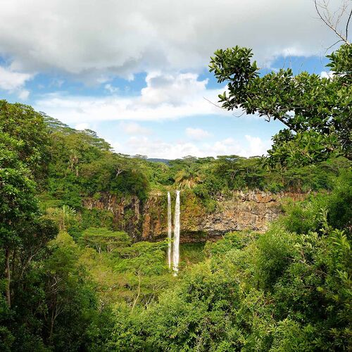 Inte långt därifrån hittar man ännu ett av naturens underverk, nämligen Chamarel-vattenfallet. Det 83 meter höga vattenfallet betraktas som öns absolut vackraste. Omgivet av palmer och frodig natur kan man se vattnet falla ut över en lodrät klippkant. Under regnperioden när vattenfallet är extra kraftfullt blir Chamarel-vattenfallet en enda stor ström, medan man under resten av året kan se två till tre separata strålar. Även om vattenfallets storlek inte kan mäta sig med världens största, så är det med tanke på den omgivande naturen definitivt värt ett besök.
