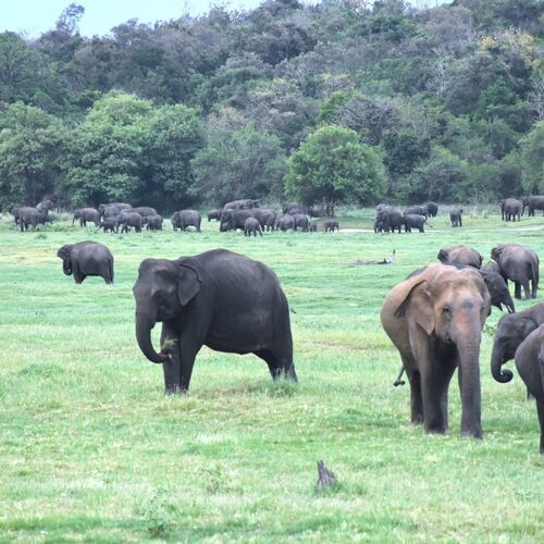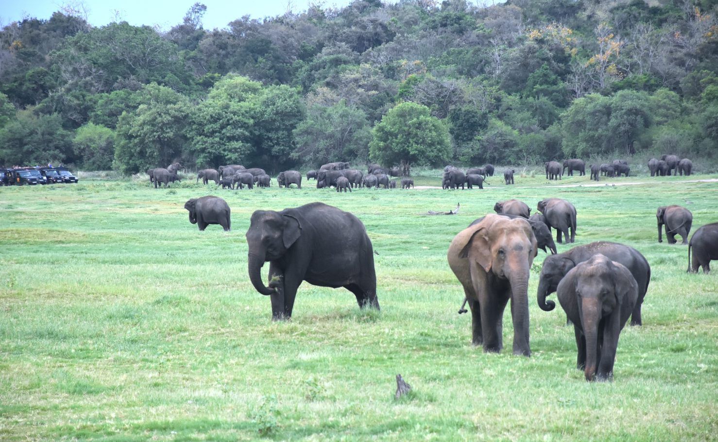 Er elsket af safari entusiaster berømt for den store samling af elefanter The ”Gathering”. I perioden maj til oktober er der rigtig god chance for at opleve den store samling af elefanter i nationalparken Minneriya og Kaudulla, hvor hundrede vilde elefanter kommer vandrende fra nær og fjern for at drikke vand og spise det fugtige græs. Det er et spektakulært syn at de prægtige dyr samlet på et sted. Kom tæt på disse majestætiske dyr, der danner stærke familieenheder. Eller flokke bestående af voksne hunner og unge kalve. Man kan også støde på store tyre, som kommer i den periode, hvor de er på jagt efter modtagelige hunner at parre sig med. Elefanterne på Sri Lanka hører til den asiatiske art og kun ca. 3 % af hannerne har stødtænder. Disse kaldes ”Tuskers” (stødtand). Måske man er heldig at se en af dem.